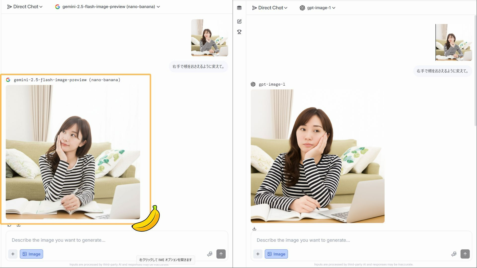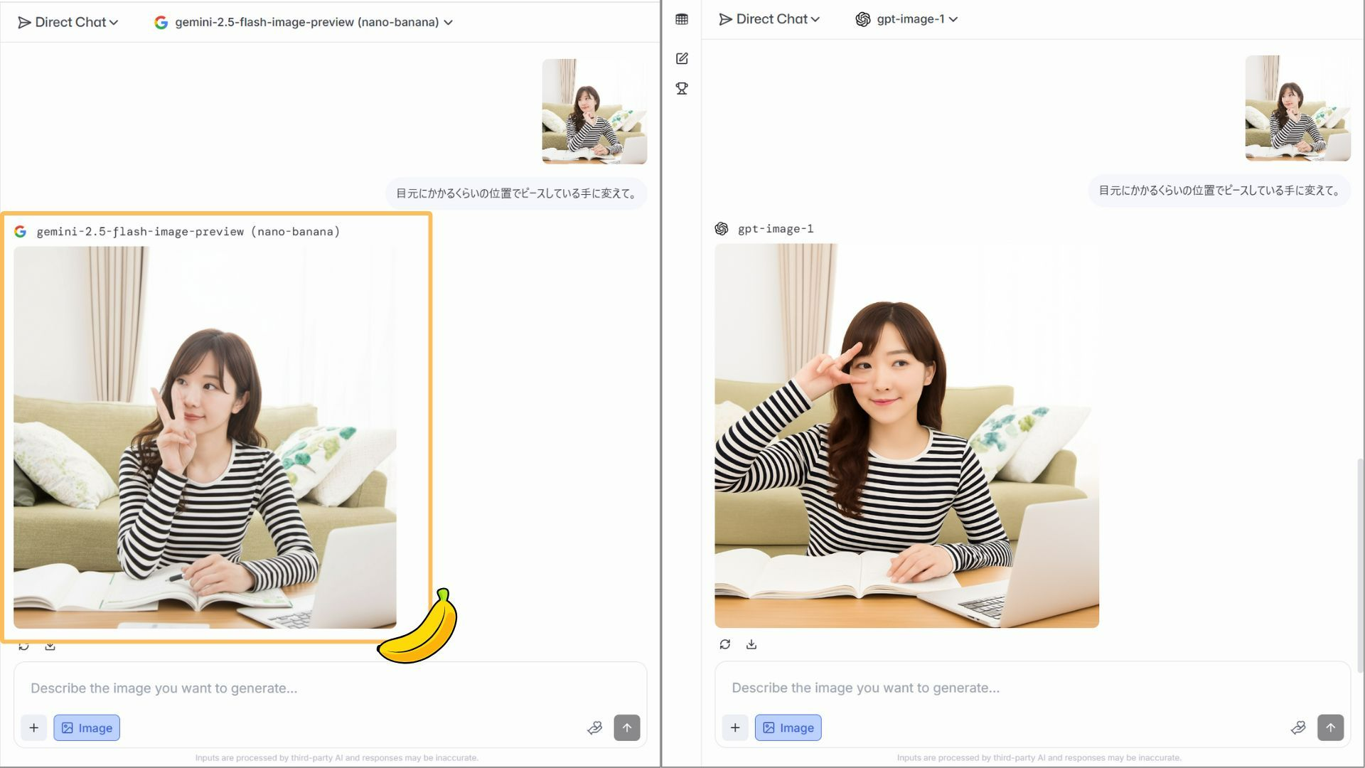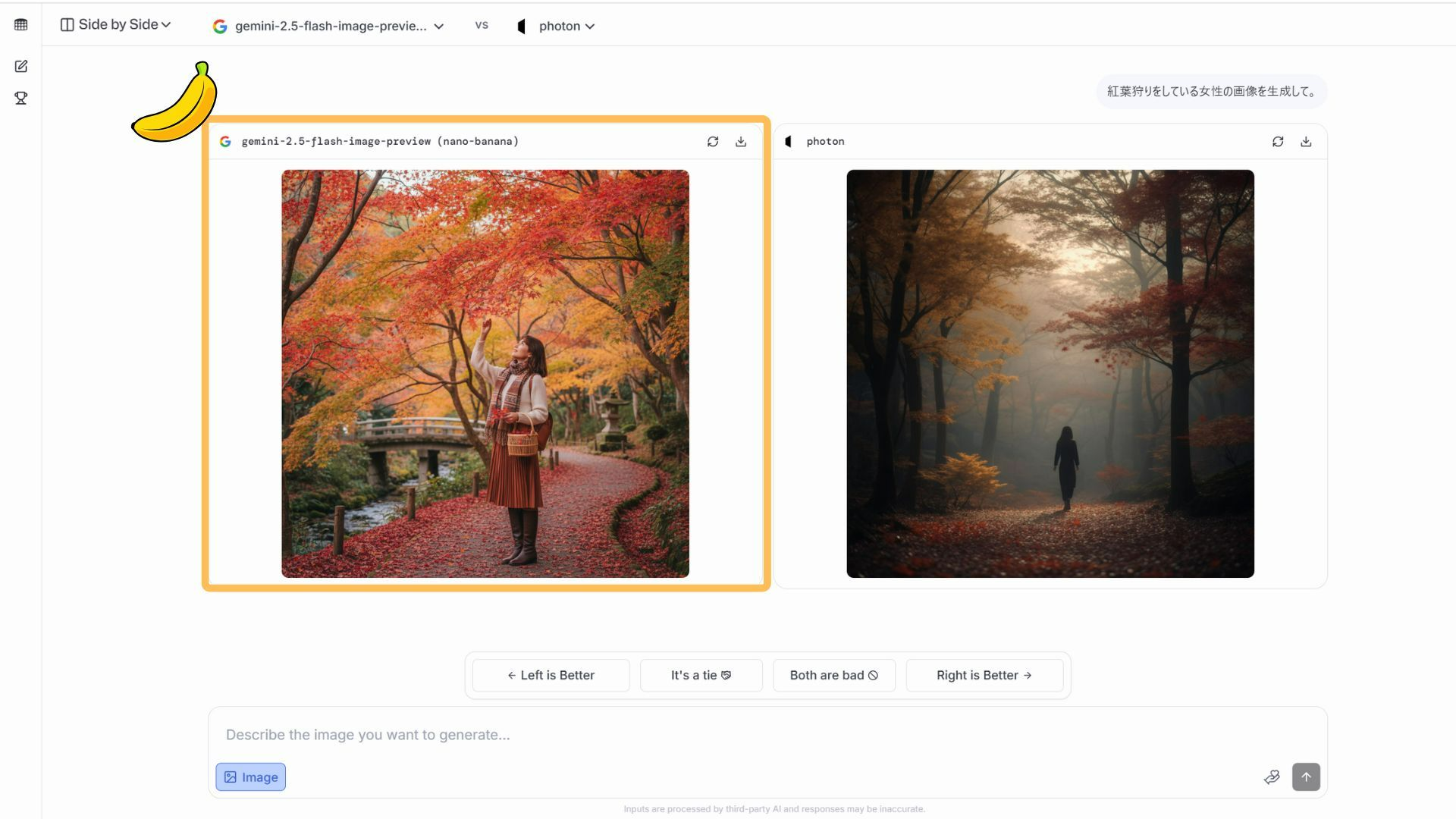 まずはナノバナナがこれまでのモデルと何が違うのか比較するために「Side by Side」で比較してみました!