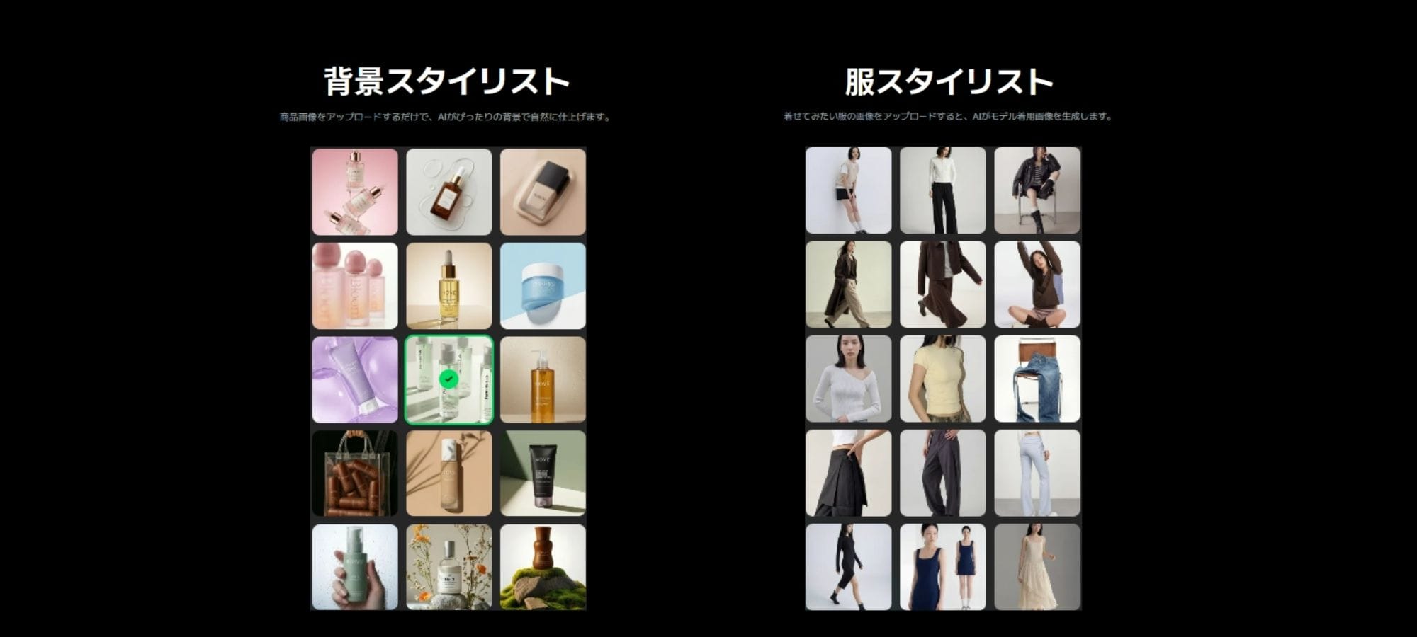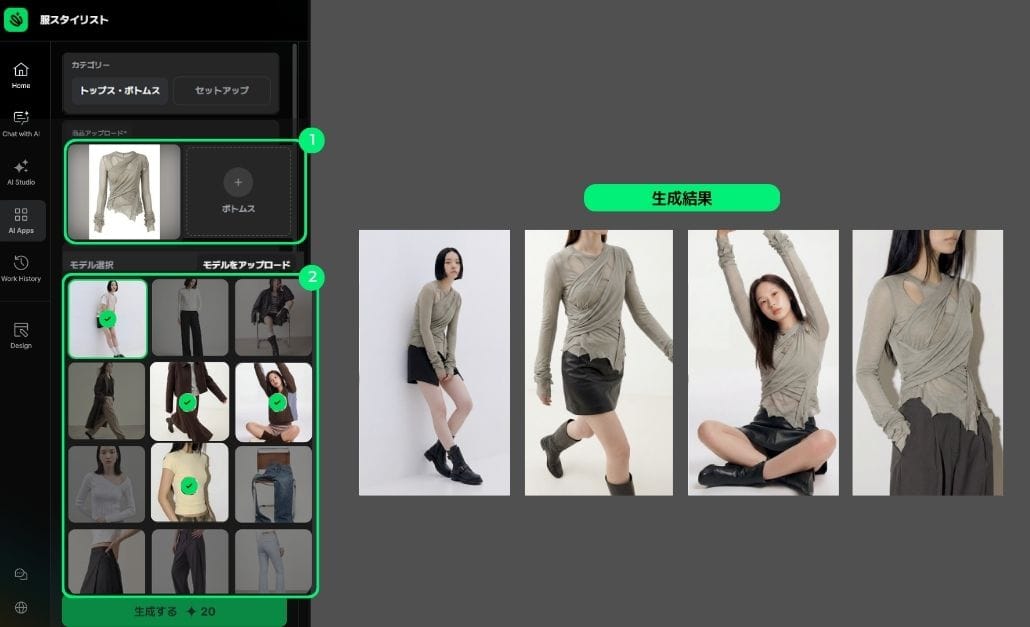 もう複雑な命令文(プロンプト)の知識がなくても大丈夫です。 ユーザーは、考えぬかれた商品のカテゴリと、セッティング済みのメニュー(プリセット)を選ぶだけ。AIがモデルの着用カットや空間演出を完成させます!