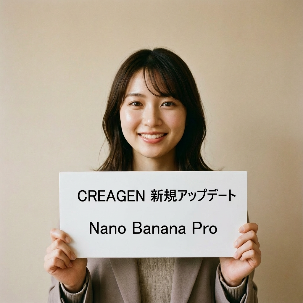 使用したプロンプト: 20代の日本人女性が「CREAGEN 新規アップデート」「Nano Banana Pro」と書かれたボードを持っている。ボードの背景は白、文字は游ゴシックで統一。自然な笑顔、高級感のある肌のテクスチャ、ニュートラルベージュの背景。