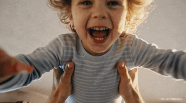 AI動画が不自然に見える理由が「継続して固定されたカメラ」にある場合が多いです。私たちCREAGEN labチームは、実際にパパが子供を「高い高い」してあげている瞬間を表現するために、意図的なカメラの手ブレ(Camera Shake)を適用しました。