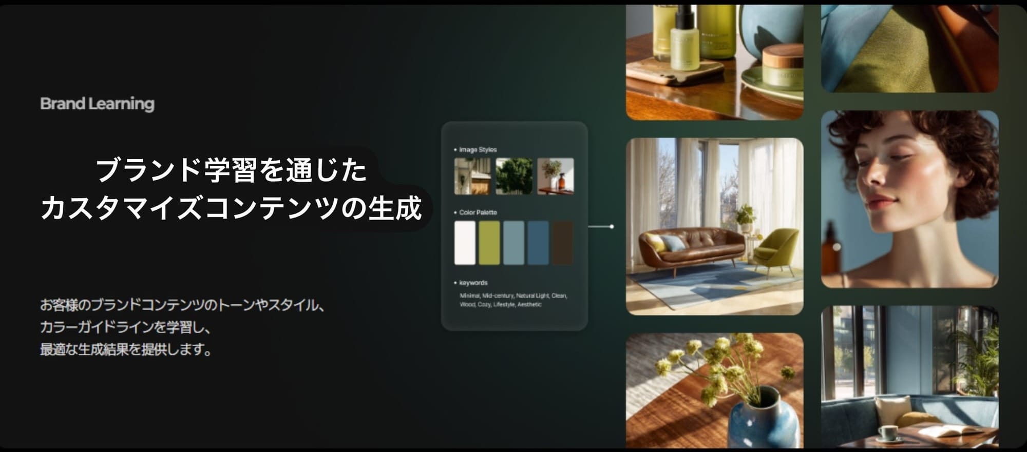単に画像を生成することを超え、AIがブランドのトンマナとスタイルガイドを事前に学習し、「自社ブランドらしい」コンテンツだけを出力します。外部エージェンシーなしでも、MDやマーケターがシステムを通じて以下のようなハイクオリティな画報を直接制作できます。