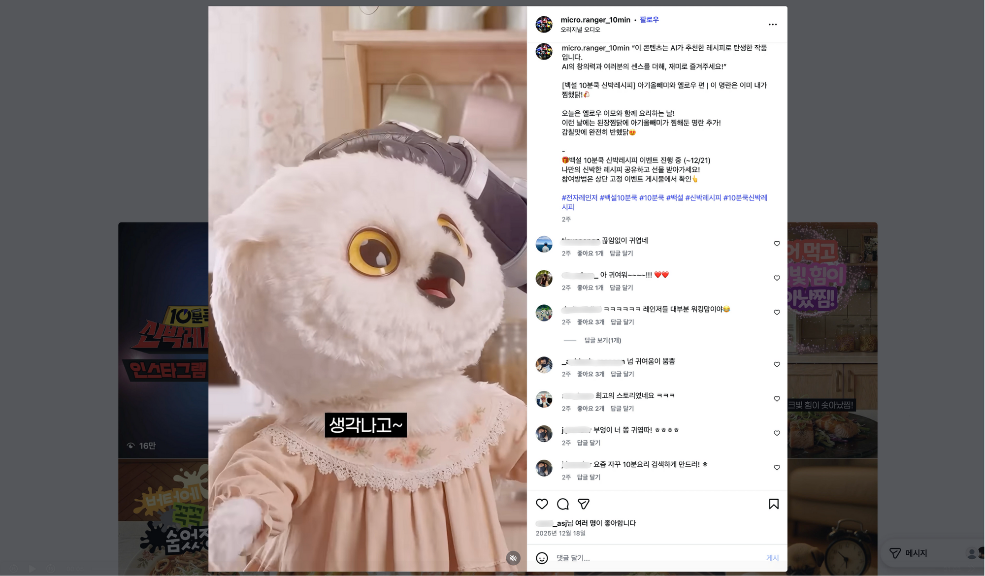 또한 "오늘은 어떤 레시피인가요?", "부엉이 너무 귀여워요ㅠㅠ" 같은 진정성 넘치는 댓글이 쏟아지며, 브랜드와 소비자 간의 찐한 인터랙티브(상호작용)가 발생했죠.