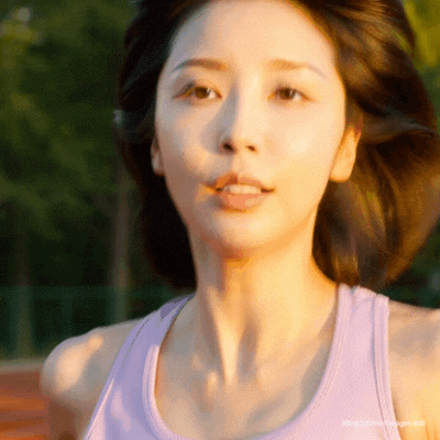 20대 한국 여성이 야외 러닝 트랙에서 자연스럽게 움직이는 장면.
